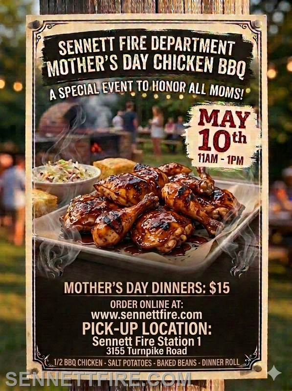 | The Sennett Fire Department's Annual Mother's Day Chicken BBQ will be held on Sunday, May 10th from 11am-1pm at the Co.1 firehouse located at 3155 Turnpike Road.